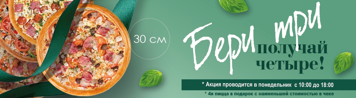 Состав пиццы: 3 пиццы по 30 см, ветчина + моцарелла, куриное филе + моцарелла, салями + моцарелла * акция действует с понедельника по четверг |